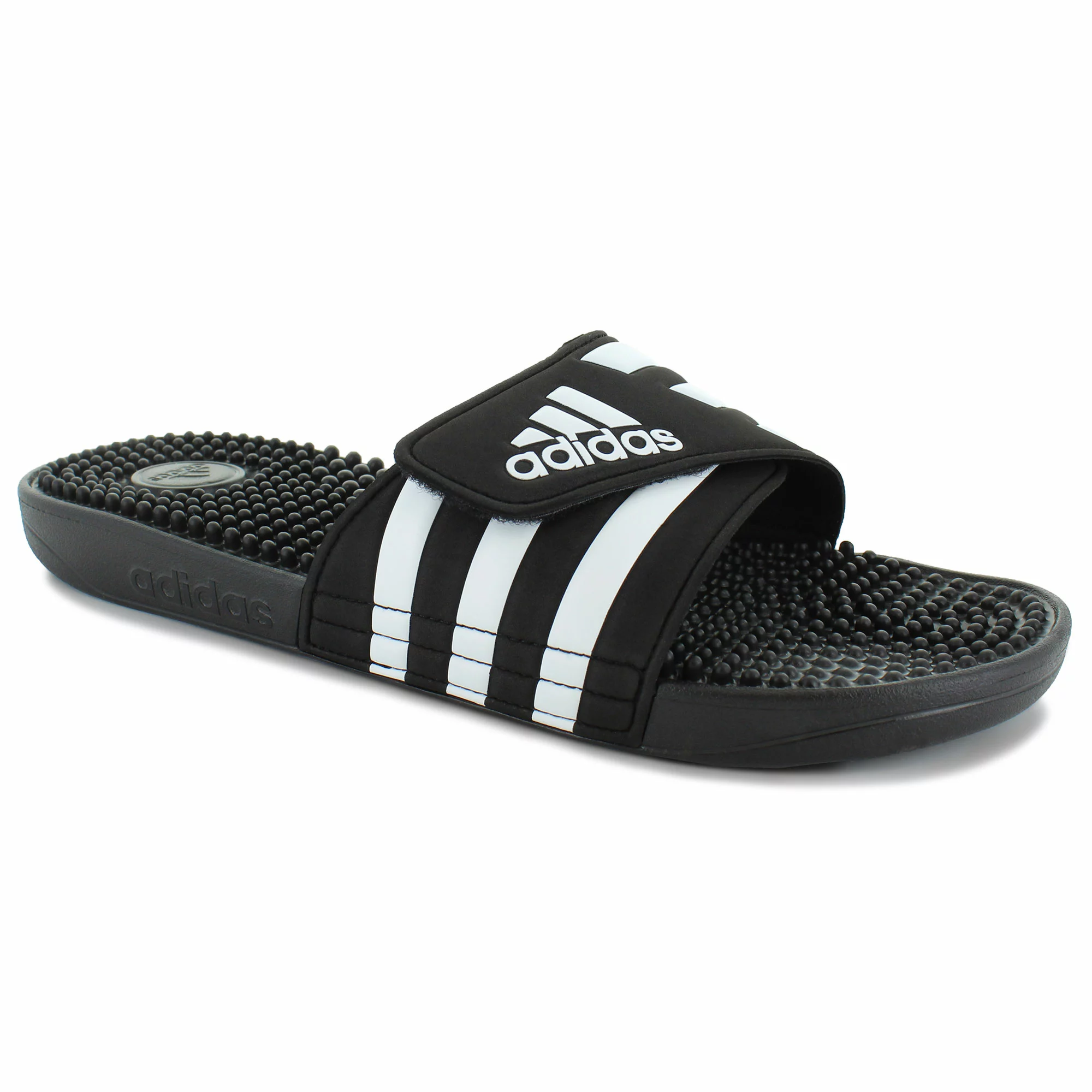Designed for post-workout recovery, the adidas Adissage Slide is the ultimate sandal for a fun sporty style, and comfort. An adjustable bandage strap provides a snug, customizable fit and features adidas’ bold 3-stripe design for added style. The footbed is constructed with EVA massaging nubs that rejuvenate even the hardest working feet after a long day, while a Cloudfoam midsole helps cushion each stride.