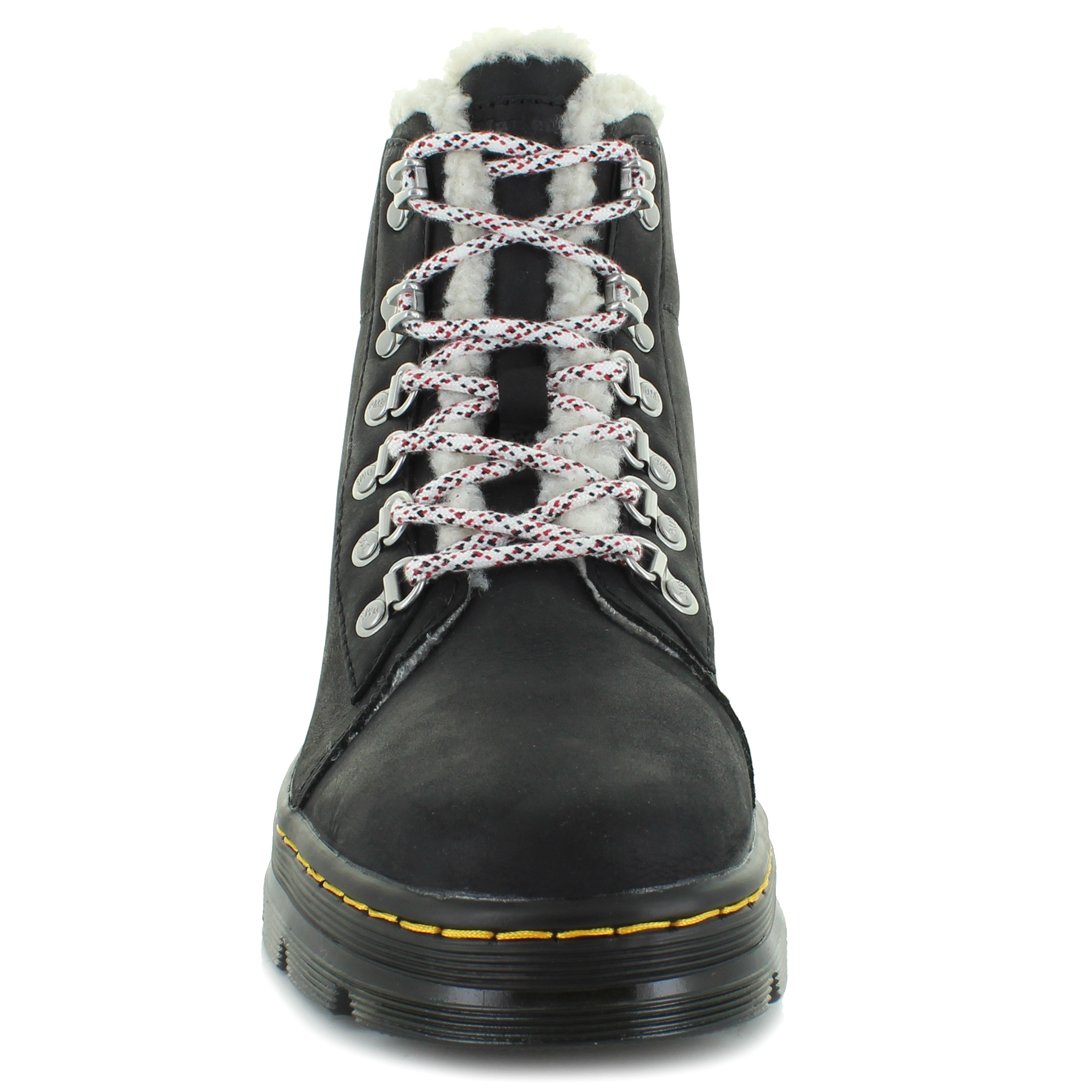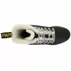 Classic rugged leather boots by Dr. Martens. This style features a lace-up front with stitching details. The faux-fur lining will keep your feet warm and comfy.