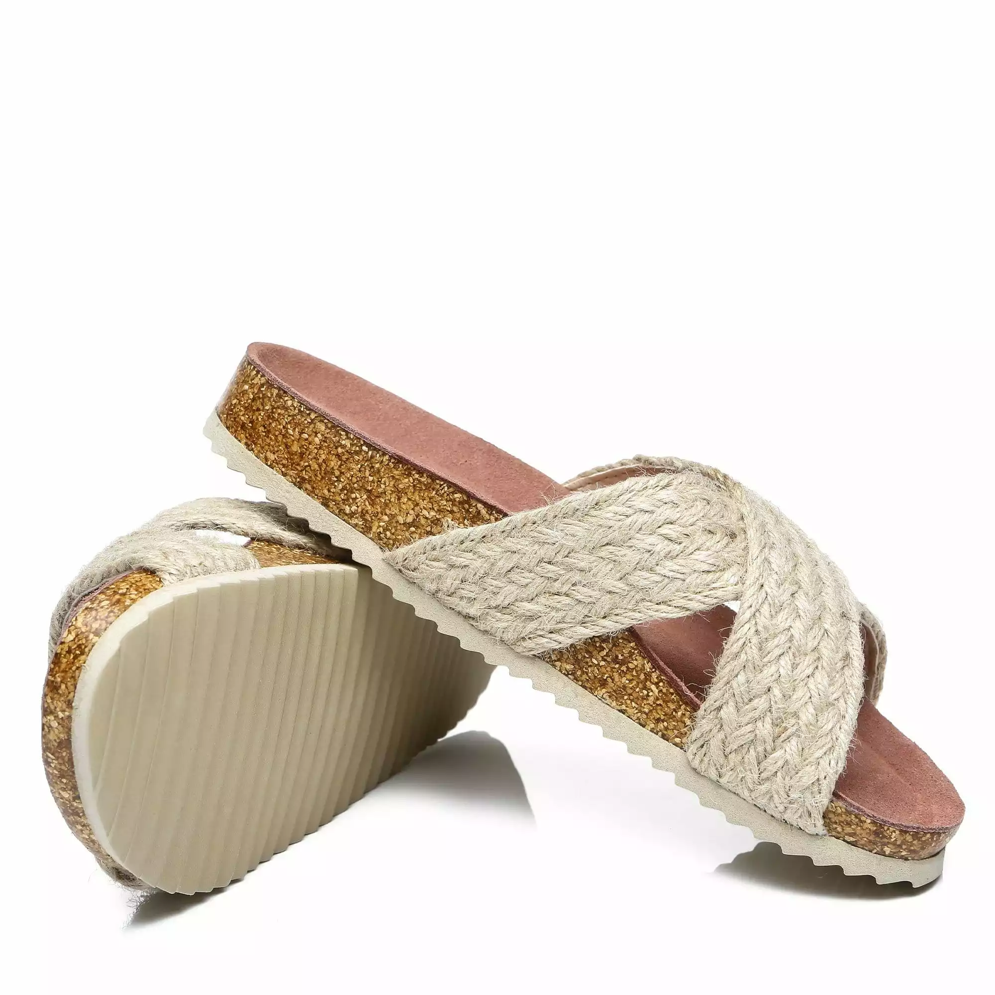 - Cushioned cork sole trimmed with EVA base and suede top