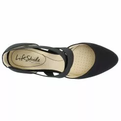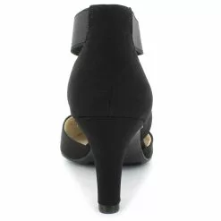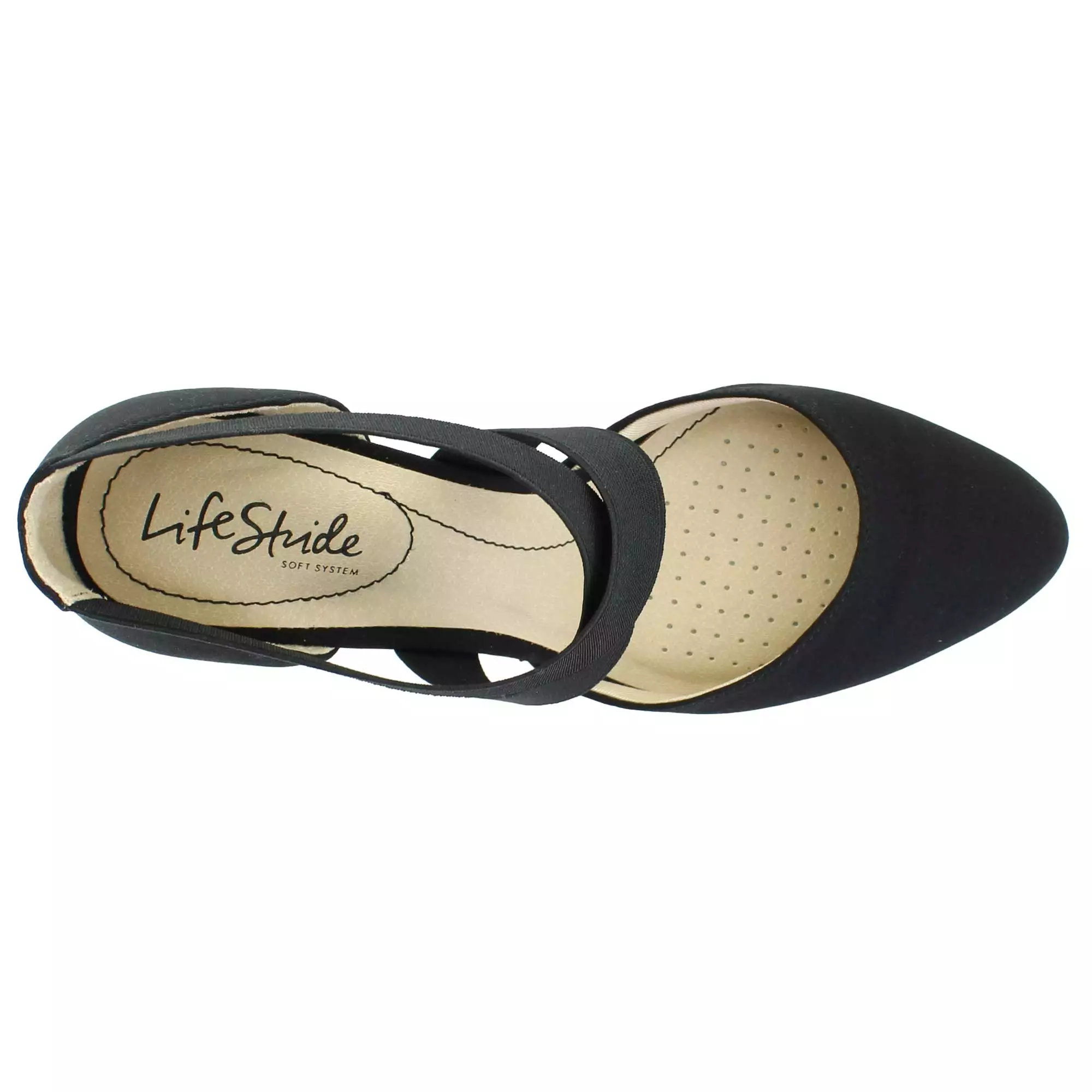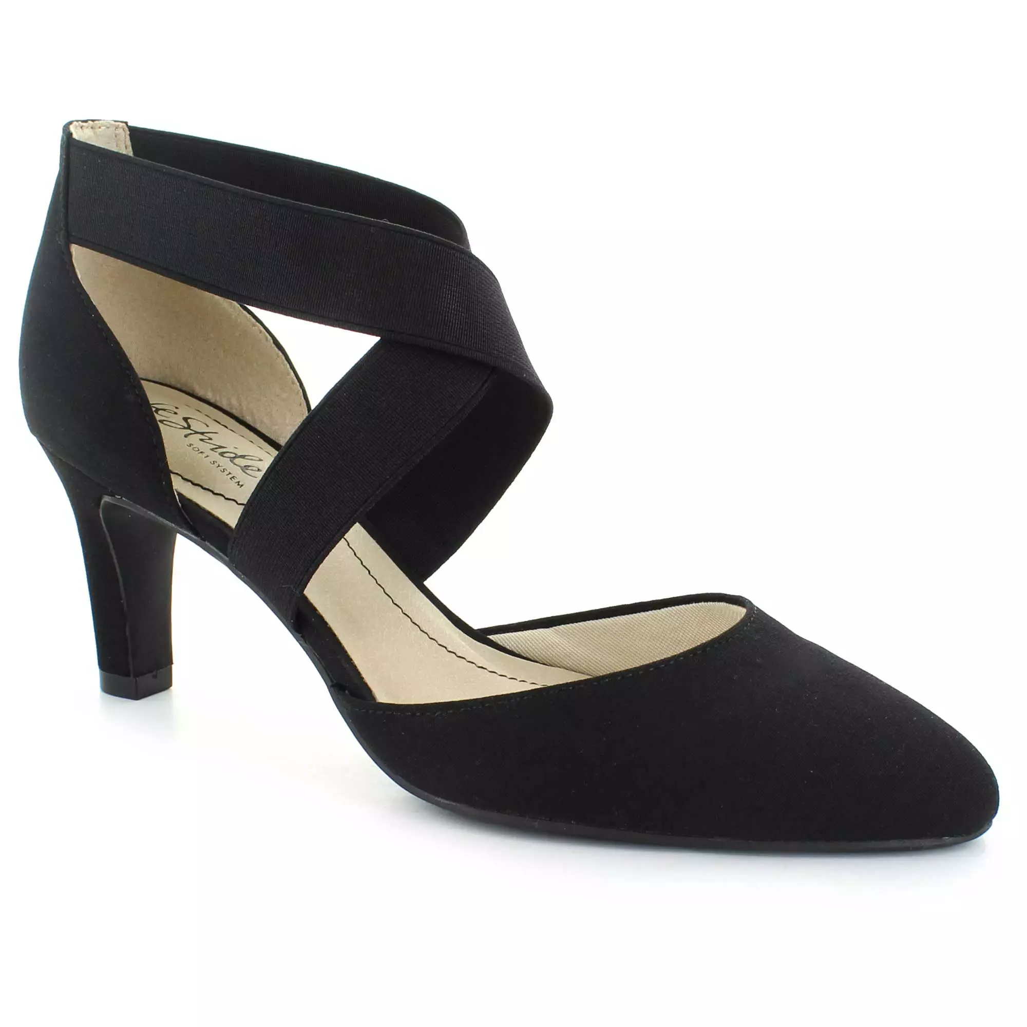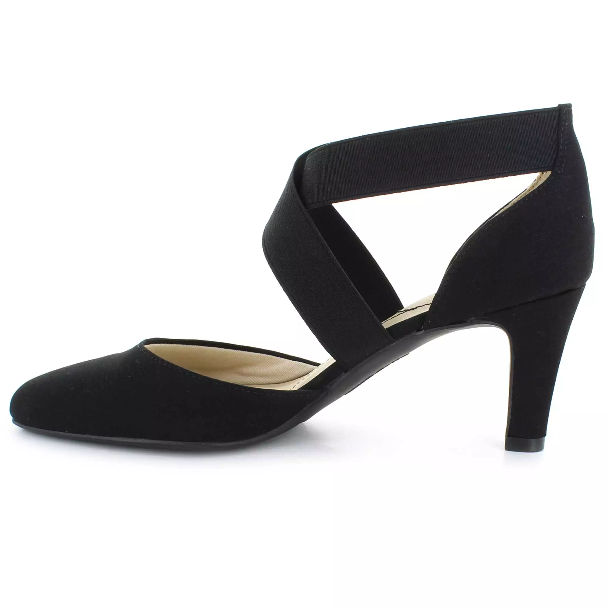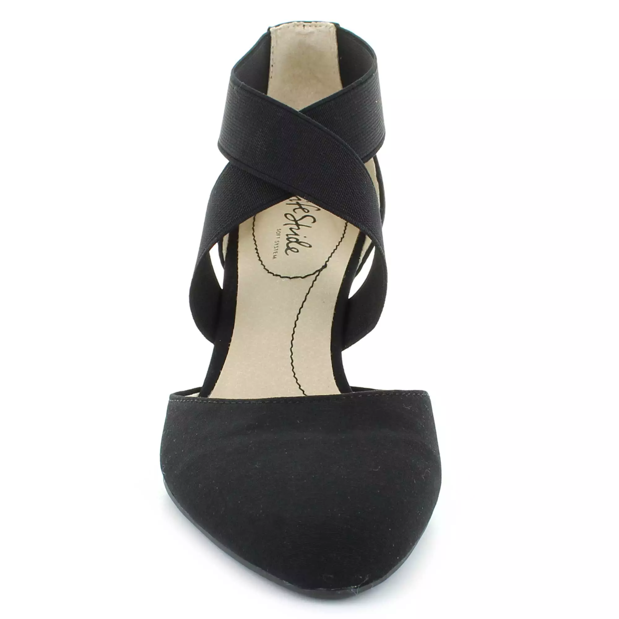 Look chic and feel comfy all day long in this flexible, goes-with-anything pump. Fabric upper with an almond-toe and crisscrossing stretch gore straps for extra flexibility and an easy on and off.