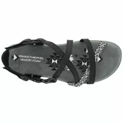 The Skechers Reggae Slim – Staycation sandal will be your perfect go-to staple this season. This sporty strappy sandal features a faux leather and fabric upper with geo print accent and cushioned Memory Foam comfort footbed.
